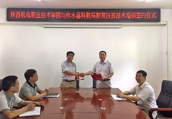 6月19日上午,我院党委副书记、副院长邓新治同志与柞水县科教局进行了会谈。双方商定我院凭借办学优势,在电子装调、汽车维修、计算机操作、车工、钳工、数控车等方面对柞水县实施教育扶贫培训。培训期间对学员食宿免费。11点左右,我院党委副书记、副院长邓新治与柞水县科教局党组成员、纪检组长汪鹏,在柞水县科教局会议室签订了《教育扶贫技术培训协议书》。