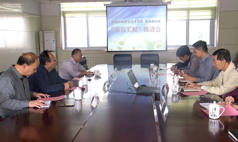 2017年9月29日下午两点半,在行政楼西会议室召开了beat365手机版官方网站、眉县教体局"双百工程"工作推进会。眉县职教中心副校长蒋亚杰、教务科长朱小强、招生就业科长翟枭,我院党委委员、副院长张新堂、工会主席张湛、团委书记李明、教务部部长王建斌、招办副主任满春燕等出席本次会议。