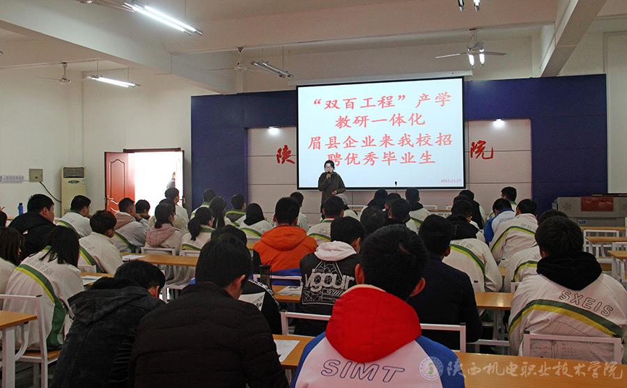 另悉,11月27日,陕西齐峰果业有限公司、陕西宝深机械(集团)有限公司领导到学院,一方面与院领导和相关系部就推进校企合作、建设产学研一体化示范基地等进行了协商,并达成一致意见;一方面,学院组织举办电子商务、平面设计、机电一体化、数控技术等专业毕业生专场招聘会,为企业提供人才支持。