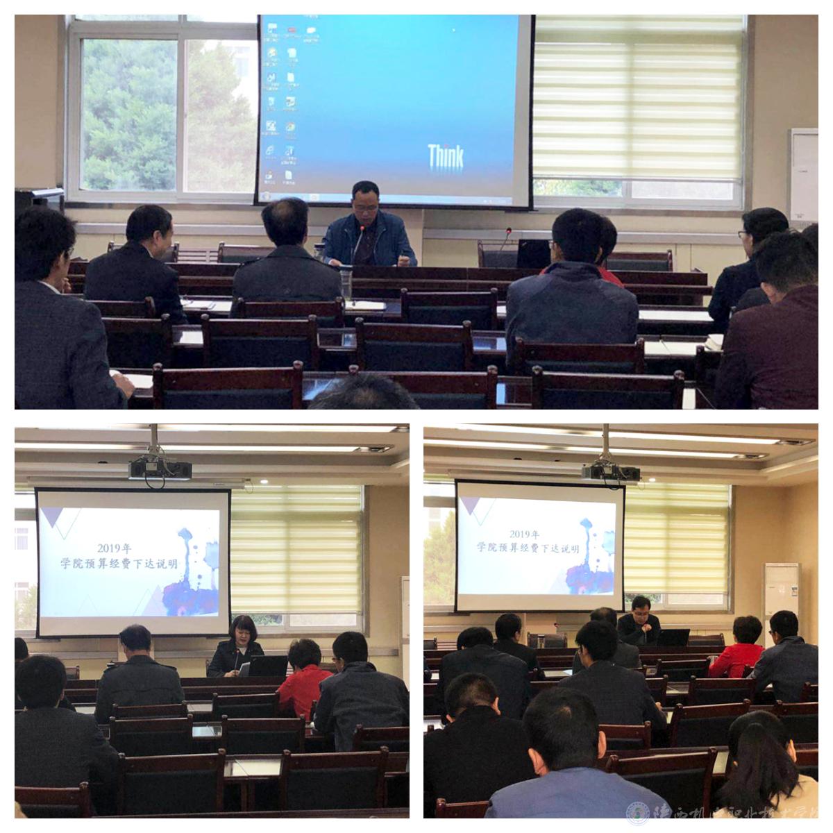 2019年04月12日上午,财务处、资产处在行政楼三楼东会议室召开2019年学院部门预算经费下达说明会,学院领导及各部门负责人员参会。会议由向院长主持。