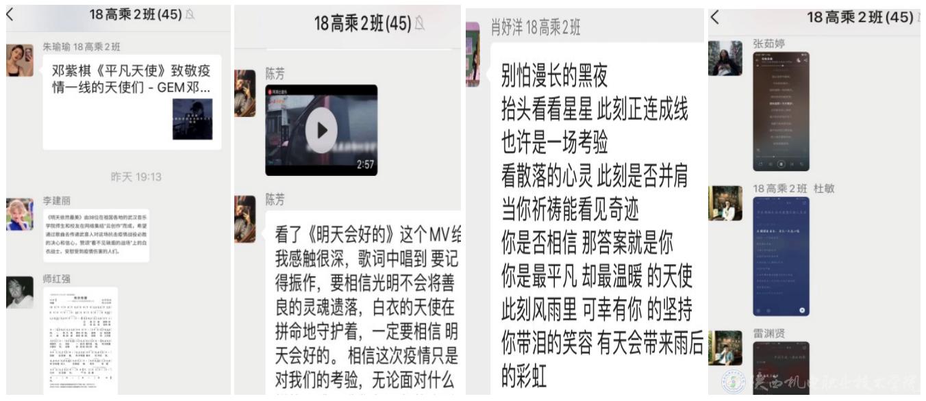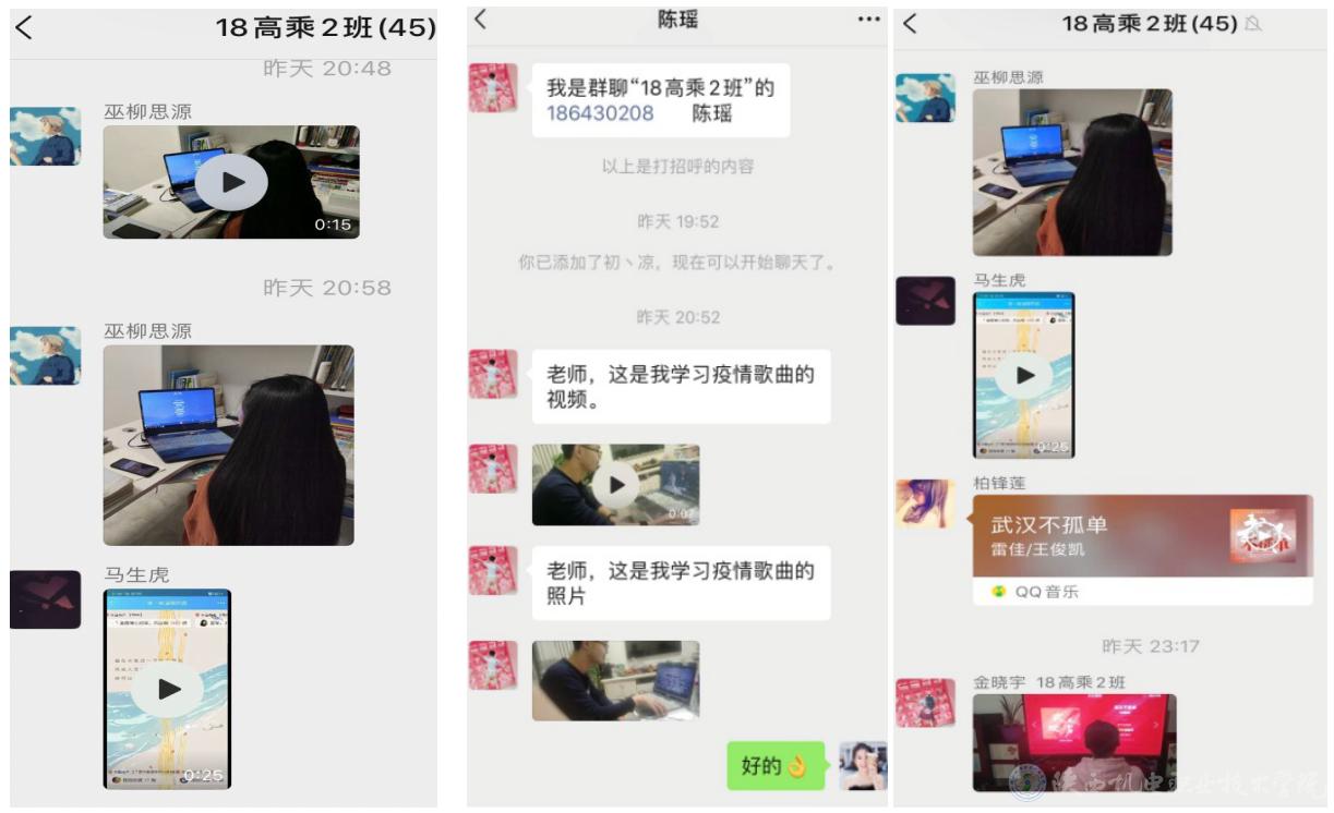 通过班级交流群对战疫歌曲《平凡天使》的学习与讨论,学生主动展示自己的学习成果,有图片、有音频和视频学习效果展示,声乐教师姚颖骏对学生发来的视频展示进行了批阅以及互动交流。