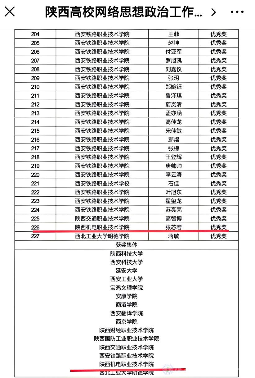 陕西高校网络思想政治工作中心、陕西省高校易班发展中心发布《陕西高校大学生新型冠状病毒肺炎疫情防控网络知识竞赛获奖名单的公告》,公布本次知识竞赛优秀组织奖名单和个人获奖名单,其中全省高校优秀组织奖15个(其中高职类院校5个),高校个人奖227个(其中高职类院校56个)。beat365师生在本次知识竞赛中表现出色,喜获“优秀组织奖”,我院16动漫五年班张芯若同学获得“优秀奖”。