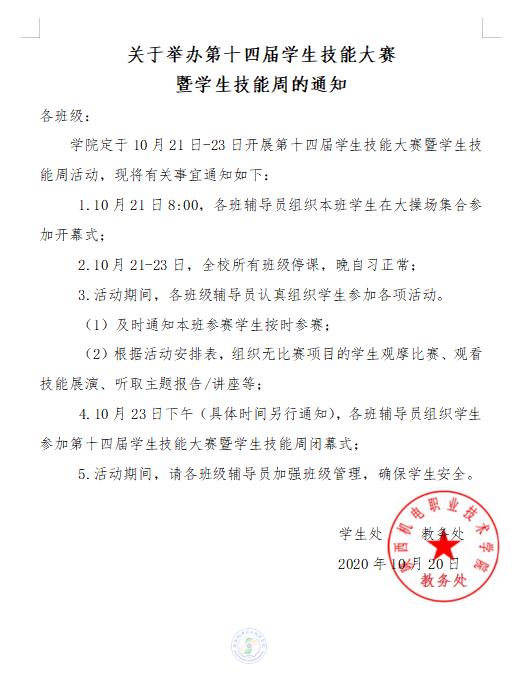 大赛点亮人生,技能改变命运。经过紧张有序的筹备,以“专业展精彩,激情创未来”为主题的学校第十四届学生技能大赛暨学生技能周各项活动将于10月21日-23日正式启动。本次活动主要内容包括:学生技能比赛、学生职业技能展示、技能大师精湛技艺展示和专家主题报告等。共设有竞赛项目18个,参赛学生700余名。