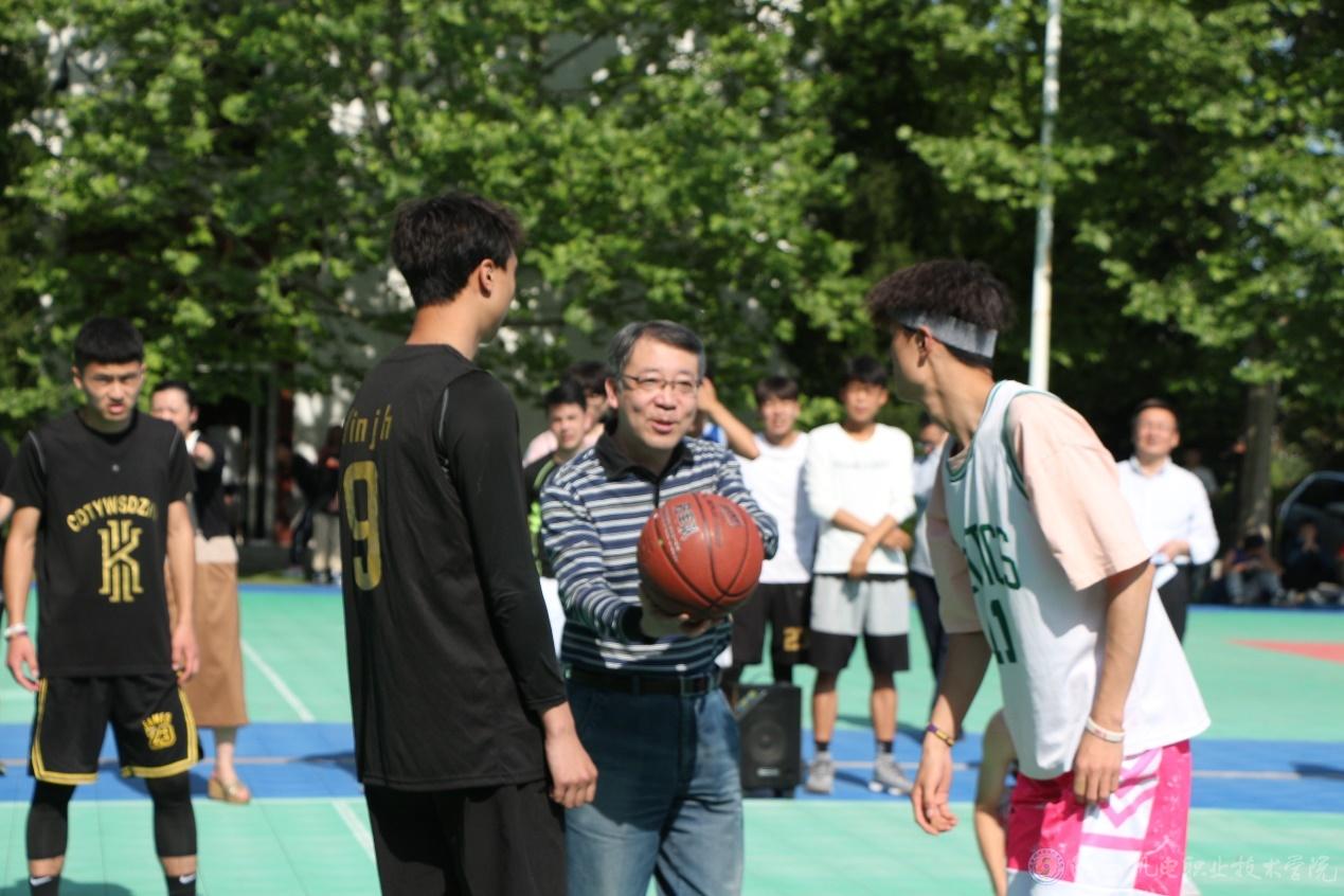 王建斌和满春燕分别为宝福路校区和蟠龙校区的第一场篮球赛开球,同时也拉开了各赛项的帷幕。
