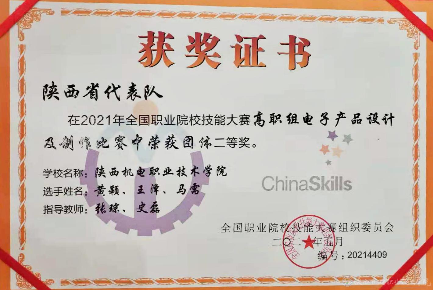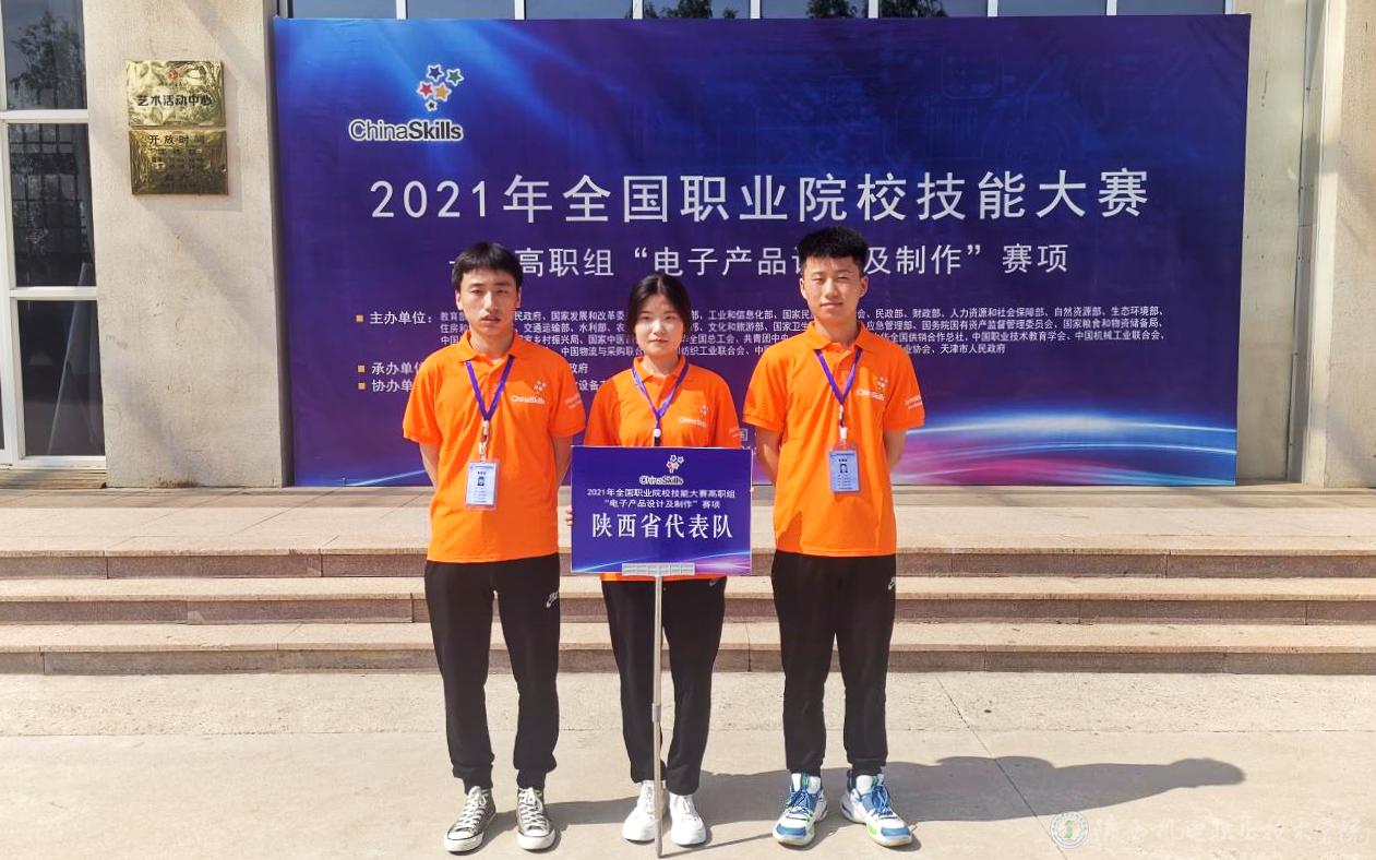 2021年6月20日,2021年“全国职业院校技能大赛(高职组)——电子产品设计及制作”赛项在烟台职业学院落下帷幕,来自全国各省市的27支代表队参与了该赛项。由beat365电子与信息学院张琼、史磊两位老师指导的学生黄颖、马需、王泽组队代表陕西省参赛。三名选手在比赛表现出了扎实的专业技能水平,实现了赛题规定的各项功能。经过8个小时的角逐,最终获得该赛项国家二等奖的好成绩。