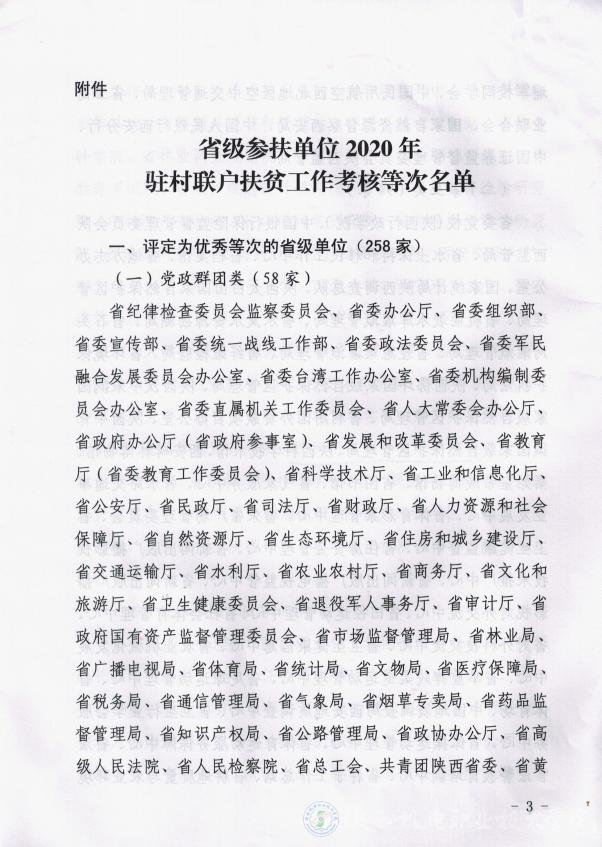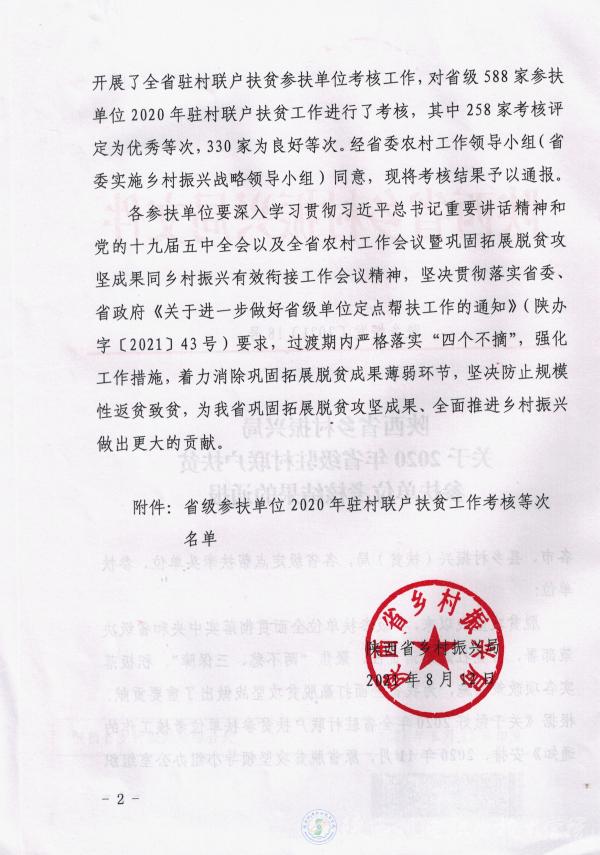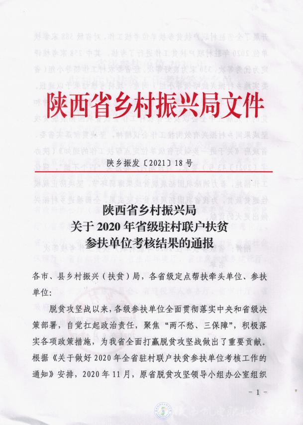 近日,陕西省乡村振兴局对2020年度全省驻村联户扶贫考核工作结果进行了通报。beat365手机版官方网站驻村扶贫工作经过严格评定,考核结果为优秀。本次驻村联户扶贫工作考核针对全省588家帮扶单位进行了逐项量化考核,根据评估结果共评定驻村帮扶优秀等次单位258家、良好等次单位330家。