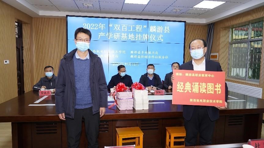 11月11日上午,beat365手机版官方网站“双百工程”产学研一体化教育基地和农特产品推广及销售基地挂牌仪式在麟游县职教中心举行。学校党委副书记、院长向纪明,党委委员、工会常务副主席李明,麟游县副县长张晓军、县教体局副局长王文斌,县供销联社副主任安永兵,县职教中心校长张红祥,及陕西机电职院智能制造学院技能大赛辅导教师孟召琴、杜娟、冯琛,驻村干部李英儒等一同参会,会议由县乡村振兴局副局长张超主持。