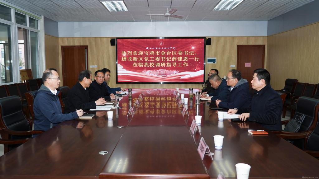 3月17日下午,宝鸡市金台区委书记、蟠龙新区党工委书记薛建恩来校调研指导学校蟠龙新校区建设工作。蟠龙新区党工委副书记刘岁科、蟠龙新区管委会副主任高翔、金台区委办主任武煜、蟠龙新区住建局局长刘建平、蟠龙新区自规局局长李新刚,学校党委书记伊逊智,党委副书记、院长向纪明等陪同调研。