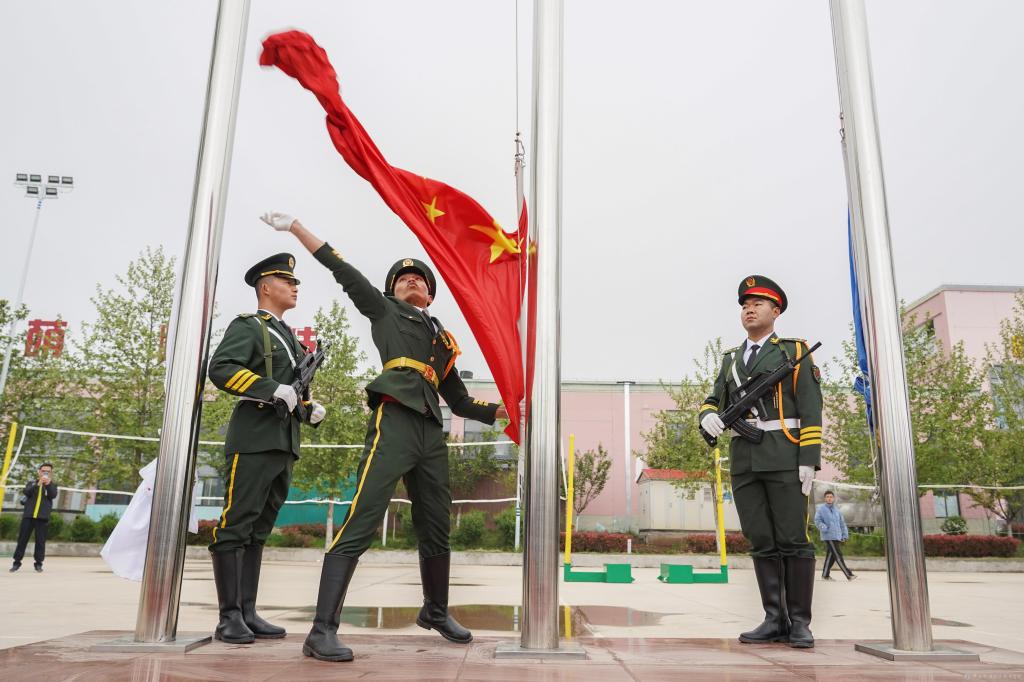 开幕式现场举行了庄重的升旗仪式。在雄壮嘹亮的国歌声中,五星红旗冉冉升起。随后,学校校旗和本届运动会会旗相继升起。