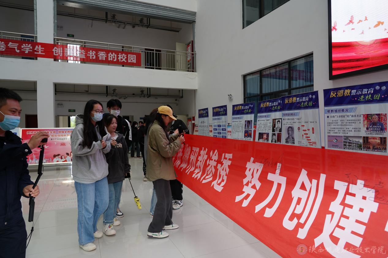 启动仪式结束后,与会领导及师生进行签名,并认真参观学习反邪教警示教育进校园宣传展板,金台区国保大队现场对学生进行教育宣传,多角度向师生介绍邪教的分类、危害、洗脑模式、真实案例和防范处理邪教问题的方针政策、法律法规等,揭露邪教骗钱害人、祸国殃民的本质,提醒广大师生增强法制观念、增强安全意识、维护国家安全,共同营造良好的校园环境。并发放了反邪教宣传手册、宣传单等资料,活动现场气氛浓厚、反响热烈。