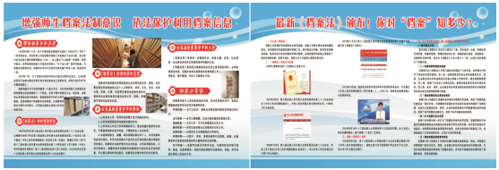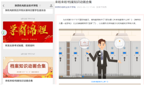 6月9日起,通过学校微信公众号推送省档案馆制作的3部动漫《未来档案馆什么样?》《榜样的力量—赵梦桃》《让抗美援朝英烈“回家”了》,以动漫形式向全校师生普及档案文化和档案知识;党政办官网档案工作专栏宣传省档案馆“6·9”宣传海报;博学楼一楼电子屏播放第16个国际宣传日主题;宝福路校区摆放宣传展板,学校通过多种形式全方位进行宣传,让全体师生真正感受到档案就在自己身边,与自己相伴,进一步扩大了档案工作的影响,增强了全体师生的档案意识,营造了浓厚的宣传氛围。