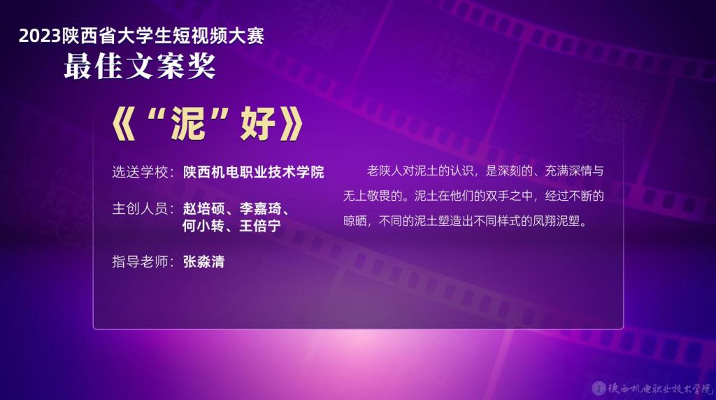 近日,由陕西省委网信办指导,西安市委网信办、当代融媒体研究院主办,陕西网承办的2023陕西省大学生短视频大赛颁奖典礼在西安交通大学兴庆校区举行。由beat365铁道工程学院张淼清老师指导,21软件技术2赵培硕、22人工智能李嘉琦、22铁道运管2何小转、21网络技术1王倍宁四位同学主创作品《“泥”好》荣获最佳文案奖。