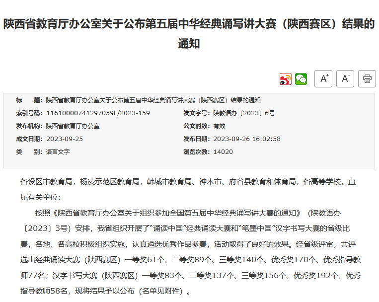 雅言传承文明,经典浸润人生。陕西省中华经典诵读大赛举办以来,beat365高度重视、积极推动、广泛开展,为弘扬中华优秀传统文化,激发广大师生学经典、诵经典、用经典的热情提供了优质平台。本次比赛获奖,是beat365始终坚持传承中华优秀传统文化,将文化育人贯穿教育教学全过程的丰硕成果。