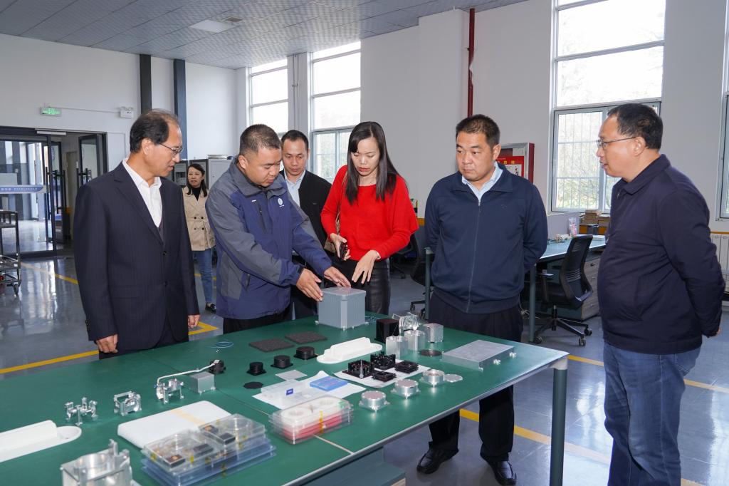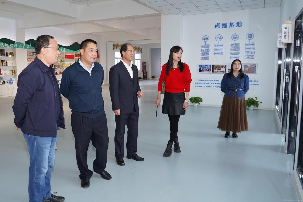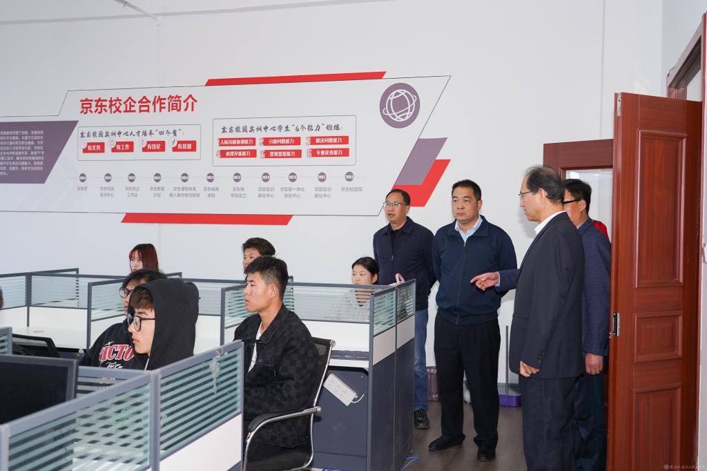 伊逊智、向纪明陪同梁松寿一行参观了学校风标产业学院、京东数字处理产业基地、无人机产业学院、擀面皮产业学院等。