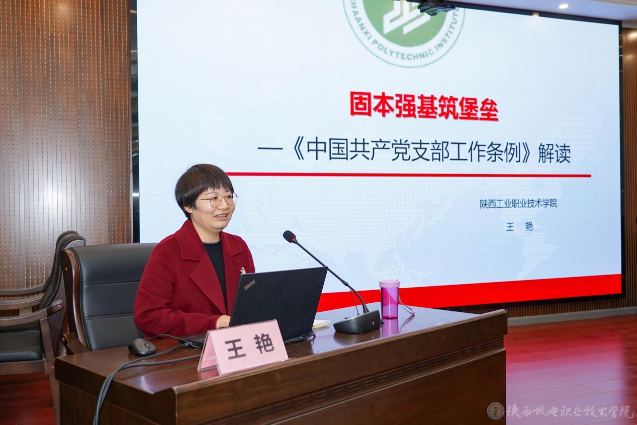 陕西工业职业技术学院图书馆副馆长,全国高校党校工作先进个人,陕西高校优秀共产党员、陕西省教育系统法治宣传教育工作先进个人王艳作题为《重视和加强党支部建设——〈中国共产党支部工作条例〉解读》的专题报告。