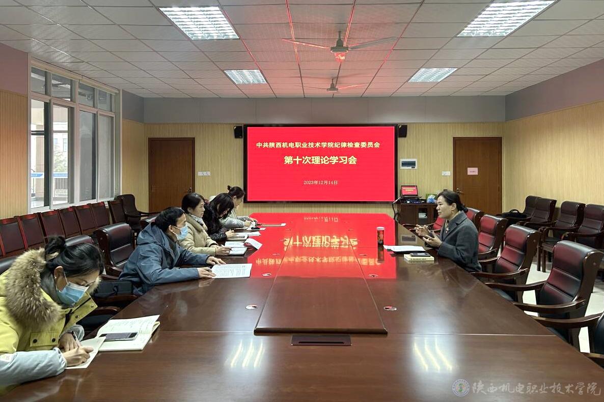 12月14日,学校纪委在蟠龙校区图书楼二楼会议室召开2023年度第十次理论学习会。纪委委员、纪律检查室工作人员参加,党委副书记、纪委书记陈红梅主持会议并讲话。