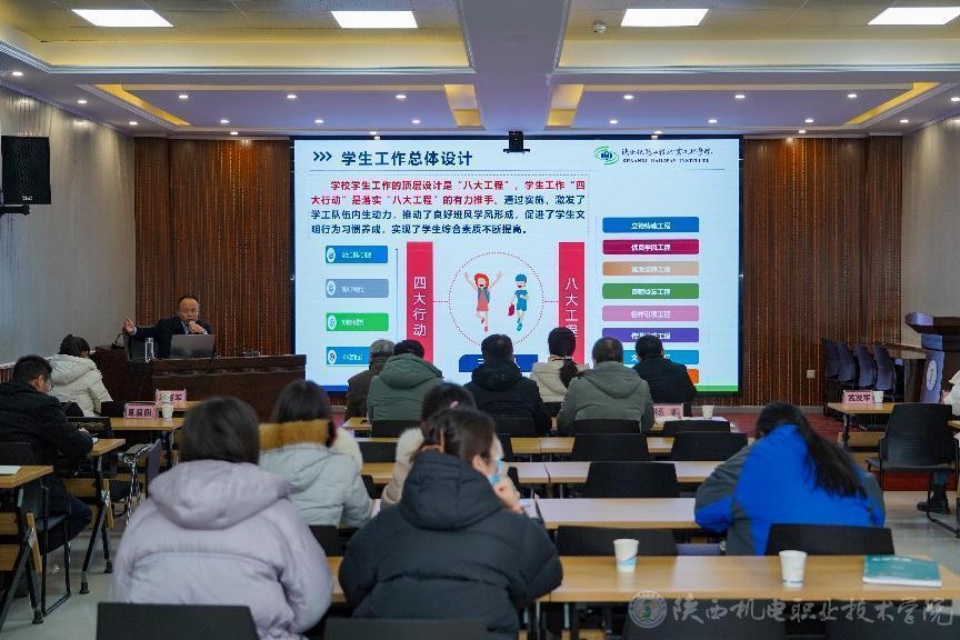 陕西铁路工程职业技术学院学生处副处长黄阿岗作了题为《立德树人担使命“三全育人”谱新篇---陕铁院学生工作交流汇报》的报告,从学生工作制度、八大工程、四大行动、学工队伍建设、学生日常管理、学生公寓管理、信息化建设等方面详细介绍了陕铁院的经验和做法,让大家感到获益颇丰。