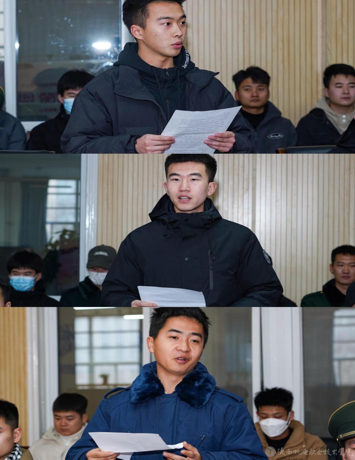 退役士兵代表李阳、程尧、白治平三名同学分别讲述了在部队服役期间的亲身经历与难忘事迹,以及通过军旅经历所学到的技能和塑造的品质,表明他们要继续发扬军人的优良传统,保持军人的本色,为社会的发展和进步贡献自己的力量。