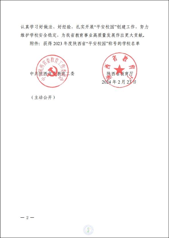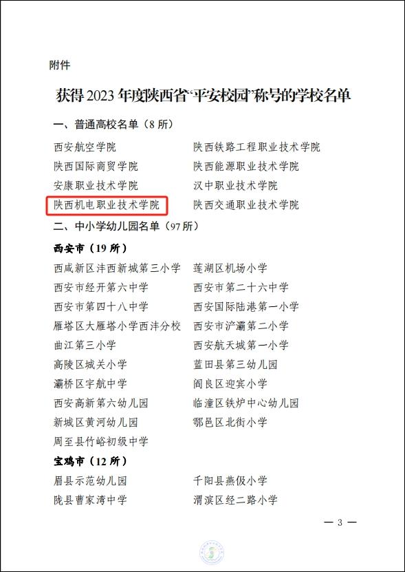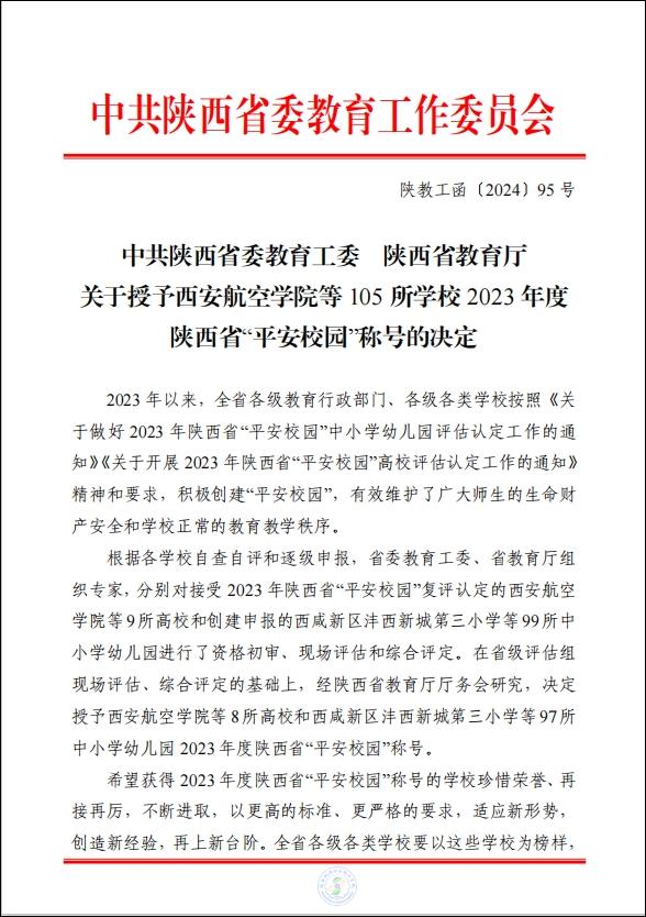 2月23日,省委教育工委、省教育厅下发了《关于授予西安航空学院等105所学校2023年度陕西省“平安校园”称号的决定》(陕教工函〔2024〕95号),beat365顺利通过评估认定,荣获2023年度陕西省“平安校园”称号。