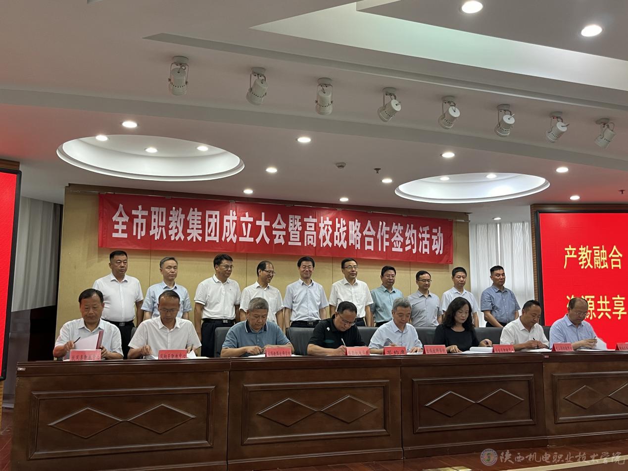 向纪明与金台区职业教育中心、凤翔区职业教育中心、岐山县职业技术教育中心、扶风县职业教育中心、麟游县职业教育中心、宝鸡技师学院、宝鸡铁路技师学院7所院校负责人共同签订beat365手机版官方网站教育集团战略合作协议。