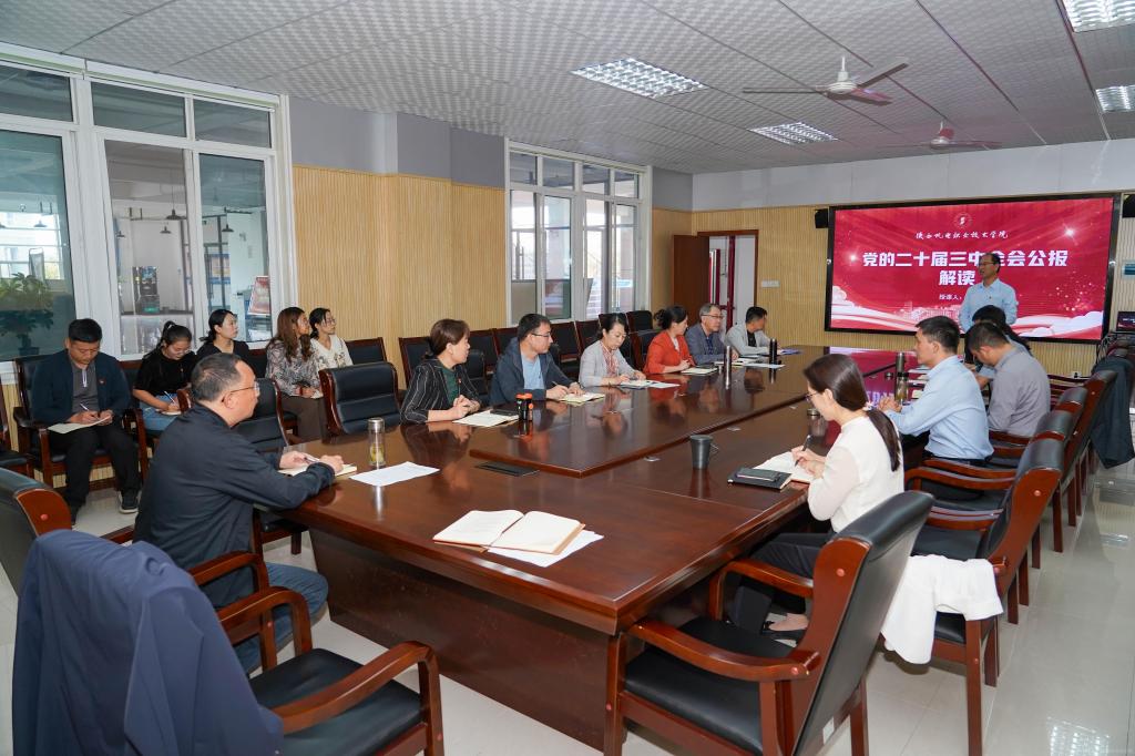本次学习采用“集中学习+专题党课”的形式进行。会上集中学习了中国共产党第二十届中央委员会第三次全体会议公报、习近平总书记在全国教育大会上发表的重要讲话、习近平总书记在甘肃和陕西宝鸡考察时的重要讲话、全省学校思政课建设座谈会精神等内容。党委书记伊逊智以《党的二十届三中全会公报解读》为题,从党的二十届三中全会基本概况、党的二十届三中全会公报内容以及《决定》的基本框架和主要内容三方面,结合学校实际,就如何深入学习贯彻全会精神提出了具体要求。