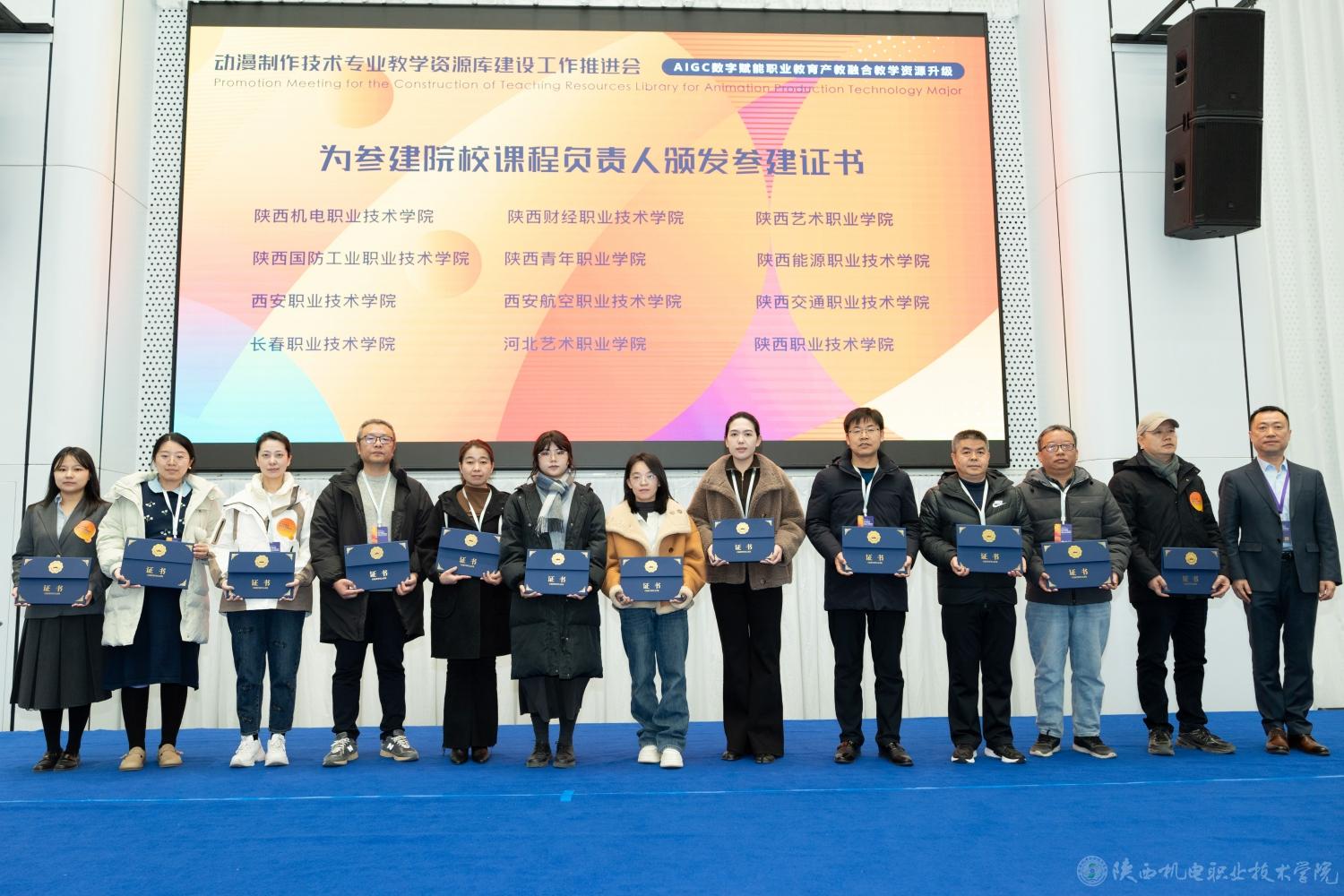 为快速提升beat365动漫制作技术及相关专业建设水平,推动专业课程体系和教学模式创新改革,12月22日,动漫制作技术专业教学资源库建设任务推进会在西安举办,beat365作为参建单位受邀参加会议。此次推进会由陕西职业技术学院主办,来自全国各地的知名企业代表、行业专家、职业院校代表齐聚一堂,共同探讨“新双高”标准要求下的AIGC数字内容产业数字化资源建设。beat365党委委员、副院长张克带队参会并主持专题分享环节,同时为参建院校课程负责人颁发参建证书。
