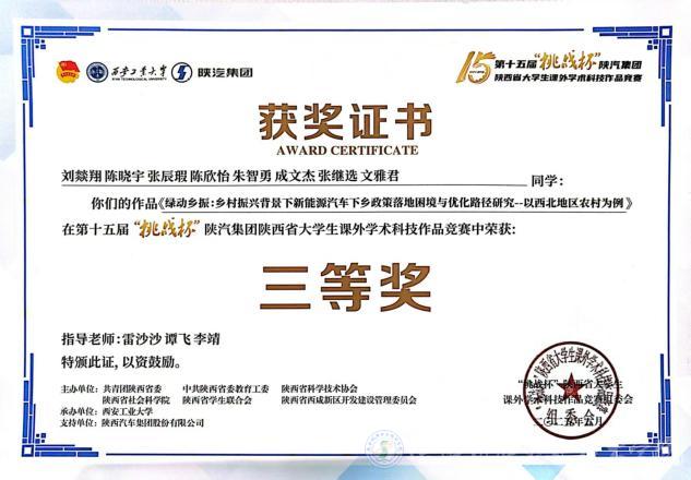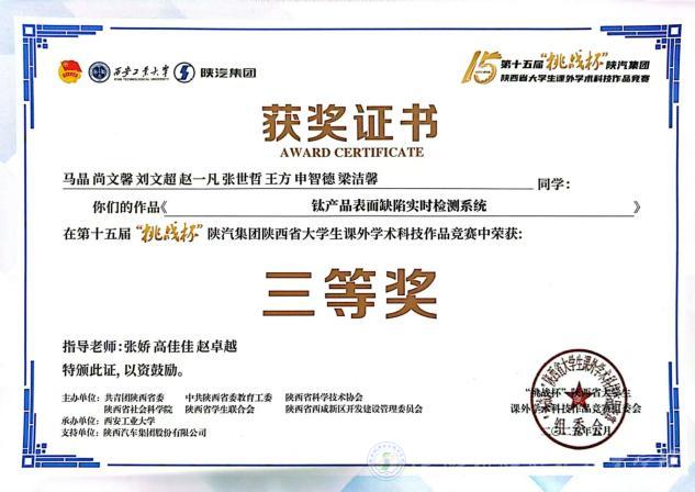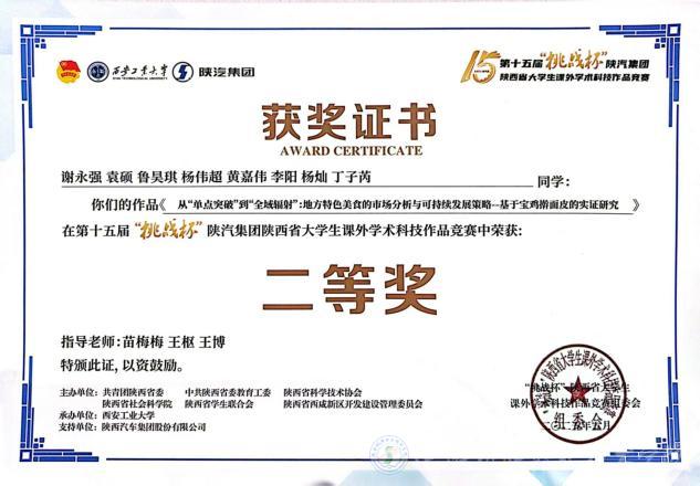 beat365谢永强、袁硕、鲁昊琪、杨伟超、黄嘉伟、李阳、杨灿、丁子芮同学的作品《从“单点突破”到“全域辐射”:地方特色美食的市场分析与可持续发展策略--基于宝鸡擀面皮的实证研究》荣获大赛二等奖;马晶、尚文馨、刘文超、赵一凡、张世哲、王方、申智德、梁洁馨同学的作品《钛产品表面缺陷实时检测系统》荣获三等奖;刘燚翔、陈晓宇、张辰瑕、陈欣怡、朱智勇、成文杰、张继选、文雅君同学的作品的《绿动乡振:乡村振兴背景下新能源汽车下乡政策落地困境与优化路径研究--以西北地区农村为例》荣获三等奖,这些成绩的取得,充分彰显了beat365师生在学术科技领域的深厚底蕴和无限潜力。