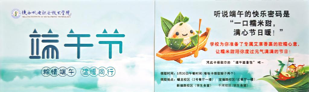 学校提前为同学们定制了精美的粽子领取卡,卡片设计别致,承载着浓浓的节日祝福。这份“端午能量包”不仅满足了大家的味蕾,更让温暖在校园里悄然蔓延。希望通过这份小小的礼物,让同学们在校园中也能感受到家的温馨和节日的浓厚氛围。