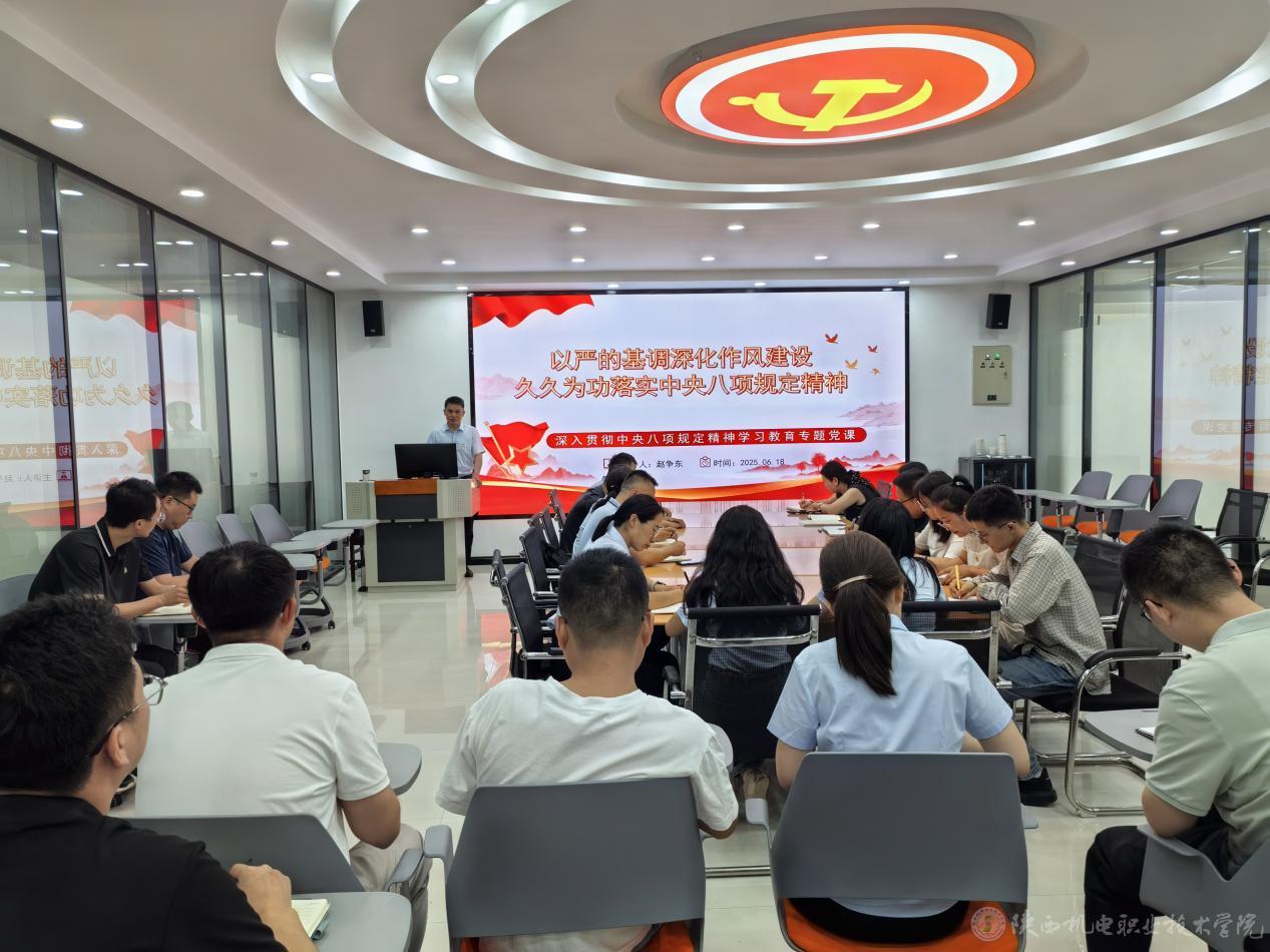 2025年6月18日上午,党委委员、院长助理、党委组织部(统战部)部长赵争东在蟠龙校区图书馆二楼思政虚拟仿真室为行政党支部、智能制造学院党支部、铁道工程学院党支部讲授题为《以严的基调深化作风建设 久久为功落实中央八项规定精神》专题党课。