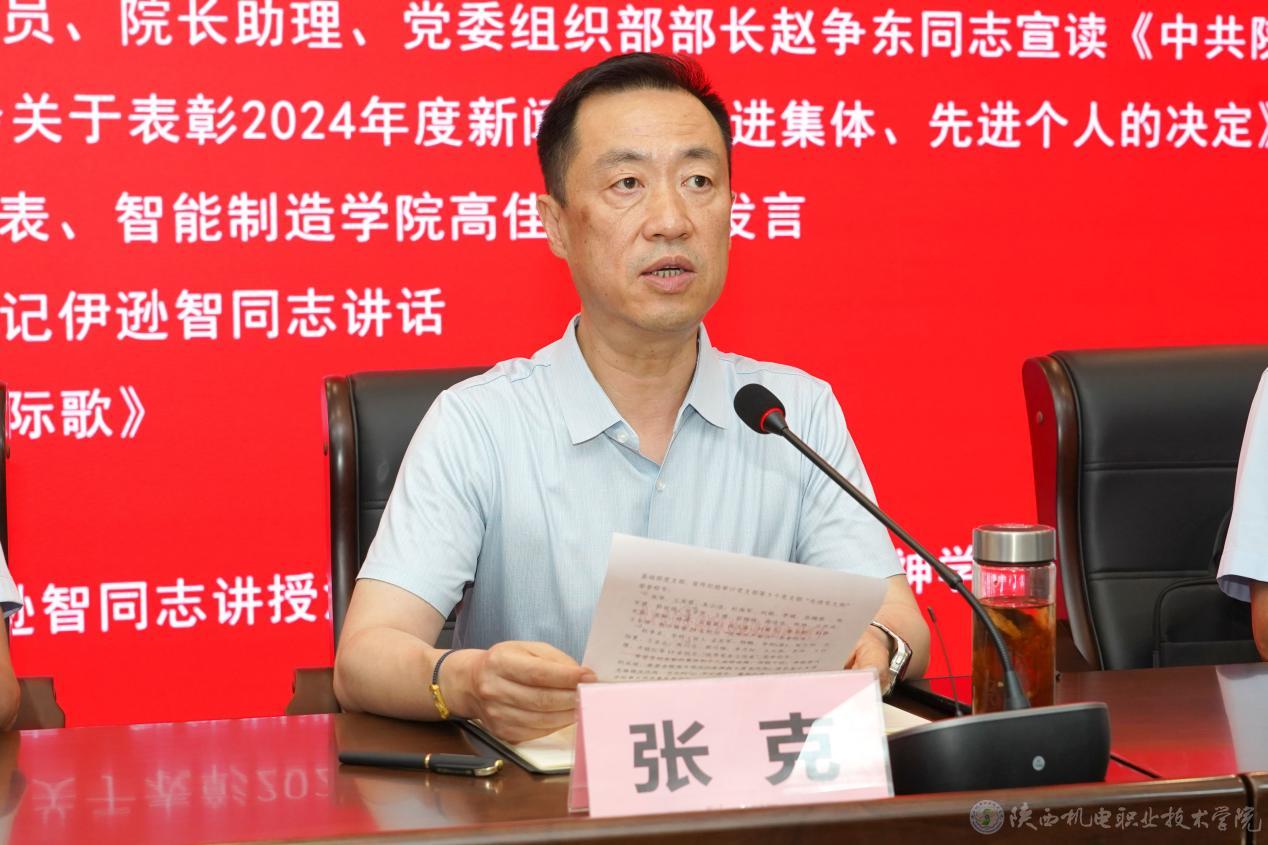 会上,党委委员、副院长张克宣读了《中共beat365手机版官方网站委员会关于表彰“先进党支部”“优秀共产党员”“优秀党务工作者”的决定》,党委委员、院长助理、党委组织部部长赵争东宣读了《中共beat365手机版官方网站委员会关于表彰2024年度新闻宣传先进集体、先进个人的决定》,校领导为获奖集体和优秀个人颁发荣誉证书。智能制造学院高佳佳老师代表全体党员作大会发言。
