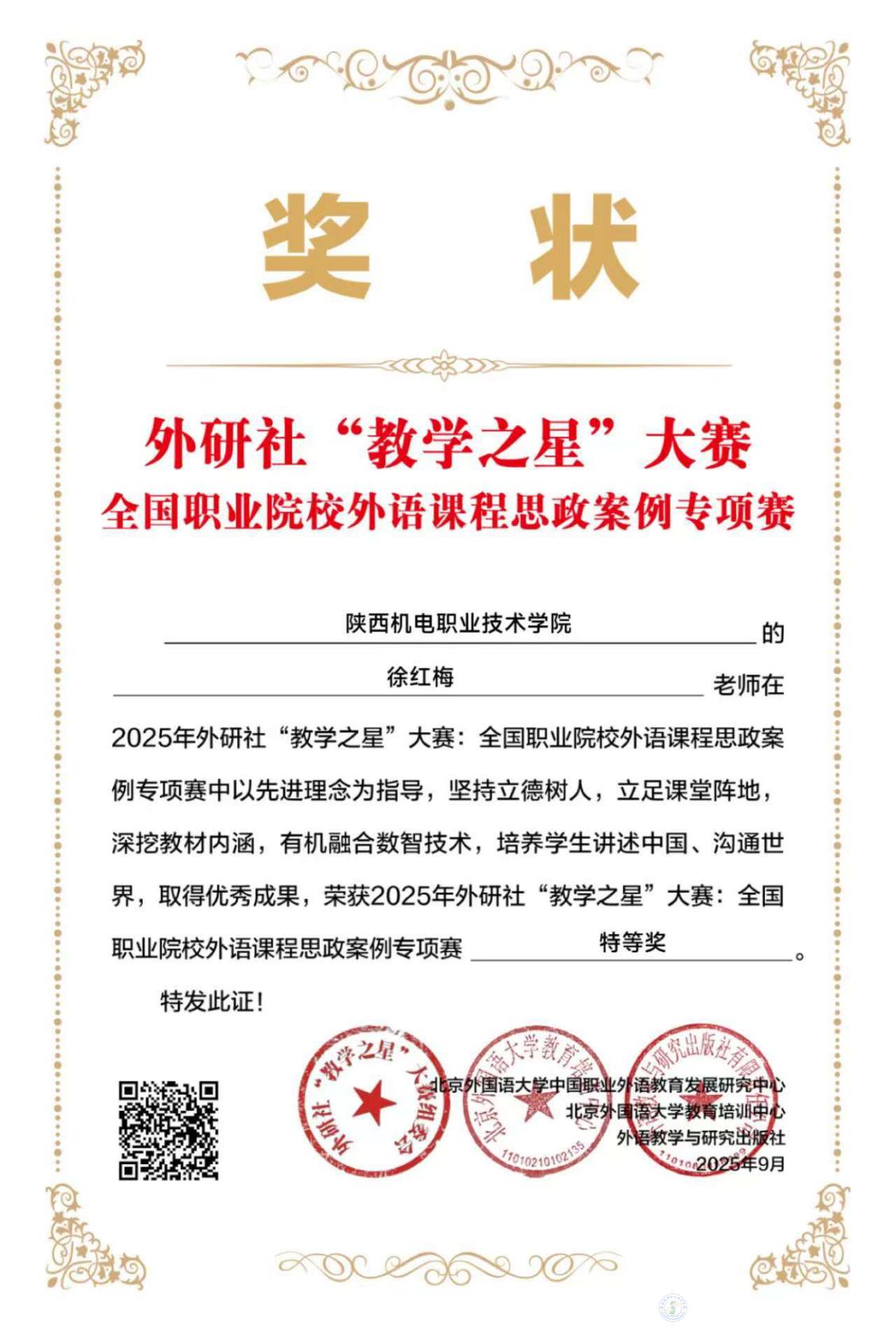 近日,2025年外研社“教学之星”大赛全国职业院校外语课程思政案例专项赛圆满落幕。beat365手机版官方网站基础部英语教研室徐红梅老师凭借扎实的教学功底和独具创新的思政案例设计,在高职英语组赛道脱颖而出,荣获全国特等奖,为学校赢得殊荣。