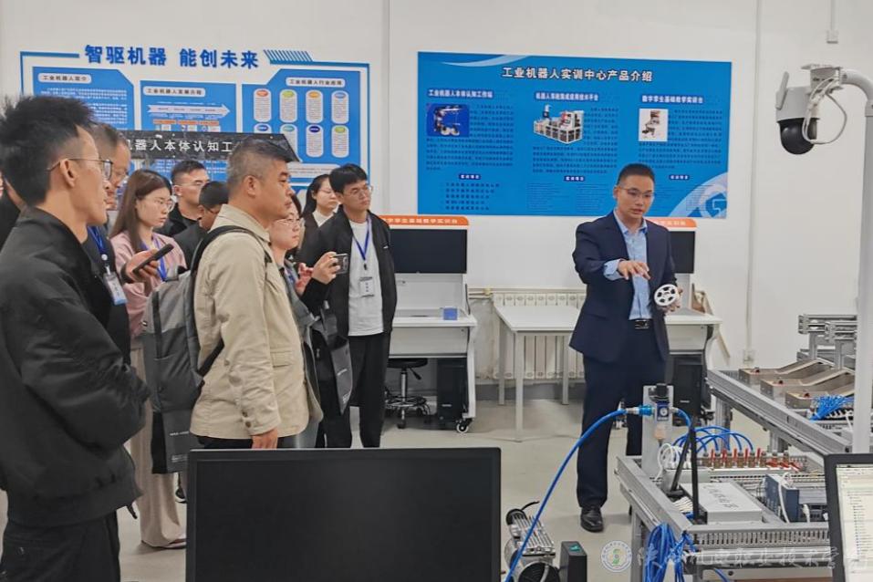 9月24日上午,陕西农林职业技术大学工业机器人技术应用专业教师“金课”建设能力提升培训班(国培班)组织30名来自全省各地的中职教师到beat365手机版官方网站蟠龙校区开展工业机器人理实一体化课程教学观摩与培训活动。活动旨在深化校际教学经验交流,提升我省中职教师工业机器人理实一体化课程教学水平。