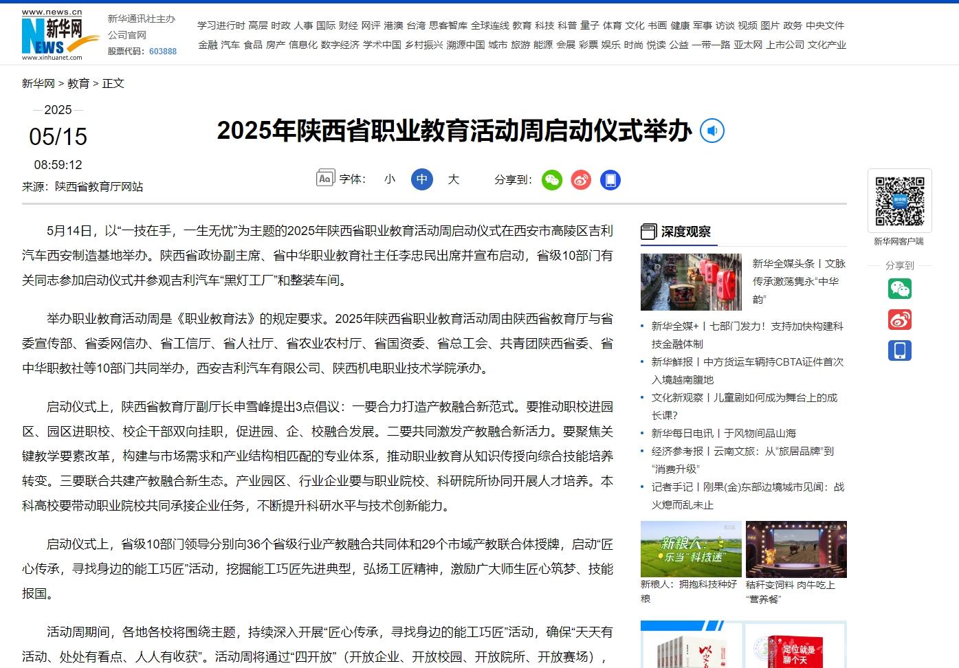 举办职业教育活动周是《职业教育法》的规定要求。2025年陕西省职业教育活动周由陕西省教育厅与省委宣传部、省委网信办、省工信厅、省人社厅、省农业农村厅、省国资委、省总工会、共青团陕西省委、省中华职教社等10部门共同举办,西安吉利汽车有限公司、beat365手机版官方网站承办。